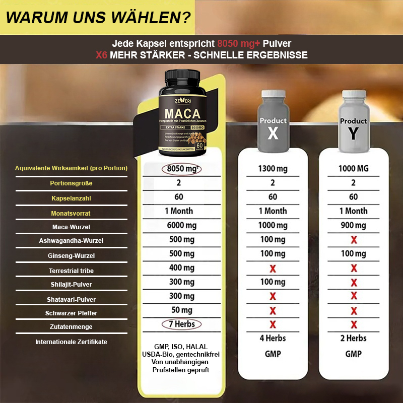 Unsere Maca-Wurzel-Extraktkapsel enthält 7 hochkonzentrierte Kräuter und liefert 8050 mg pro Portion. Nehmen Sie täglich nur eine Kapsel ein.*